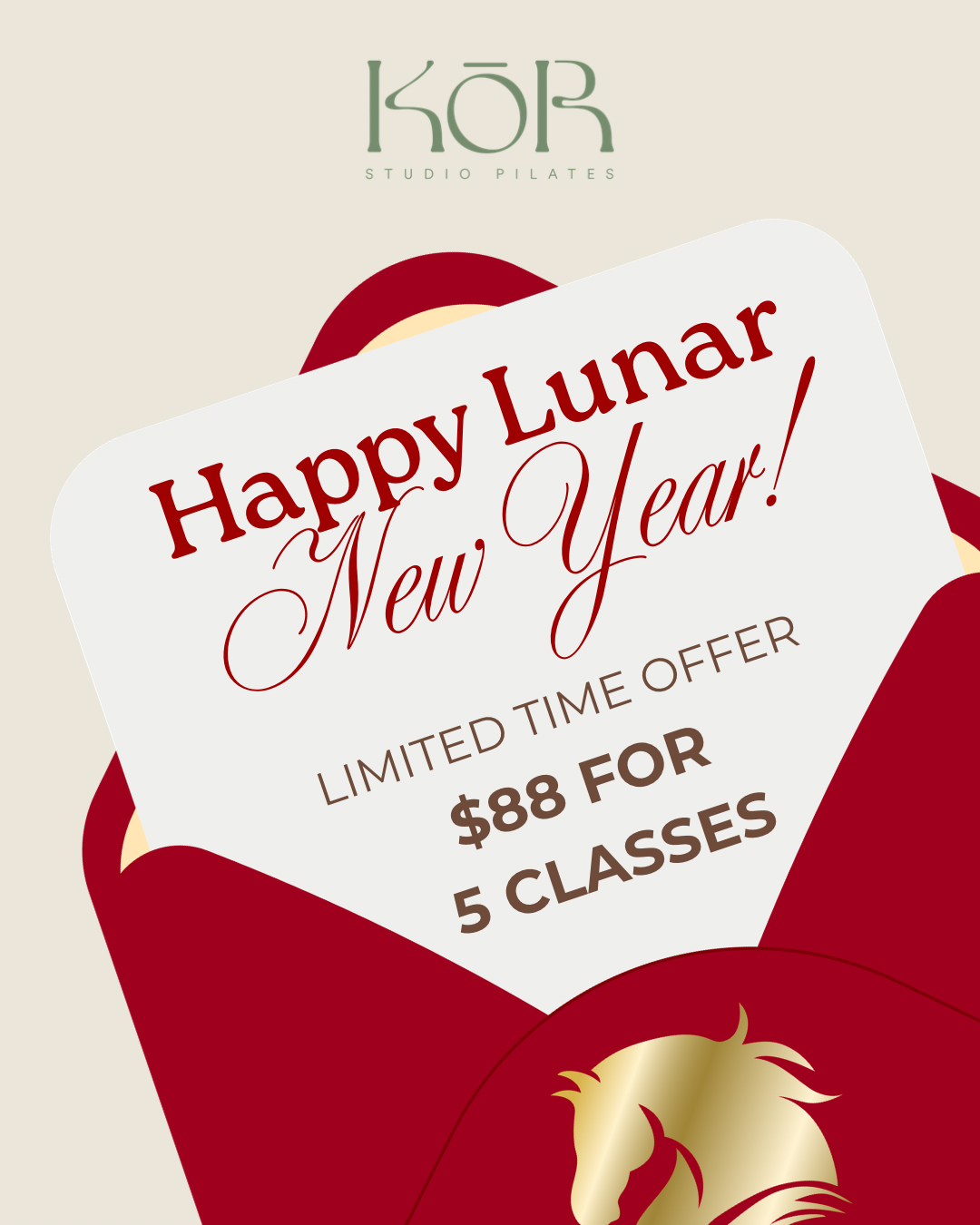 Back to All Events Happy Lunar New Year! Tuesday 17 February 2026 8:00 pm Tuesday 24 February 2026 11:59 pm Google Calendar ICS Kick off the Year of the Horse with balance, energy, and good vibes! Special Offer: 5 classes for just $88 - your lucky start to a strong, healthy year.Grab your bundle and celebrate the new year with us! You can find it in your app (available to new and returning clients) for 8 days only. It’s our way of sharing a bit of luck and joy with you as we step into the new year together.